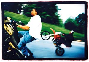 Within a half-hour, the group has gathered on the empty promenade along the reservoir, down the hill from the pavilion. Nearly 20 dirt bikes circle the stretch of pavement, each guy taking turns going vertical. Guys on ATVs whiz by, their legs outstretched in an almost balletlike display. A moped goes vertical, looking more like a begging, squat-legged dog than the more elegant beasts that pass him, but the rider gets plenty of cheers. Then the party breaks up with a couple shouts of "Five-oh." Sure enough, a police cruiser, blue lights flashing, has stopped at the top of the hill. Half the crew zips off to meet on the other side of the park, white exhaust smoke wafting into the young green foliage. The remaining bikers wait it out.